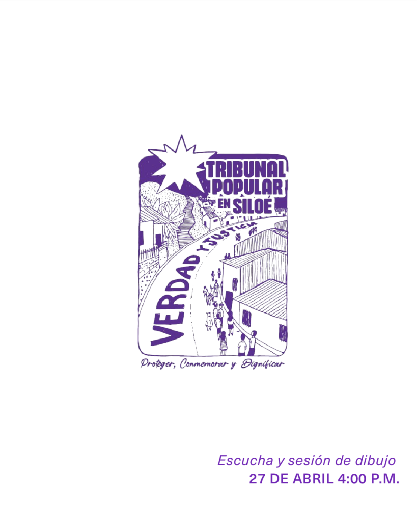 El segundo encuentro será el sábado 27 de abril a las 4:00 p.m. con el Tribunal Popular en Siloé, quienes en la búsqueda por la reparación y justicia a la violencia del estado ocurrida durante el estallido social en 2022, han construido un libro del que nos compartirán distintas memorias de los habitantes del barrio. La presentación estará acompañada por dos artistas que dibujarán lo narrado durante la actividad. La dibujada es abierta, si quieres participar, ven. No requiere inscripción.